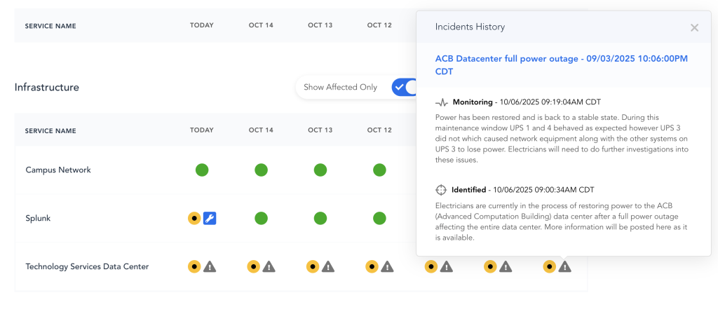 The benefits of the status page are clear. It can help you save time by letting you know instantaneously whether an issue is on your end or campuswide. It really can help with reducing stress when assignments are on the line. With advanced notifications about scheduled maintance you can also plan around things to avoid any unpleasant surprises.